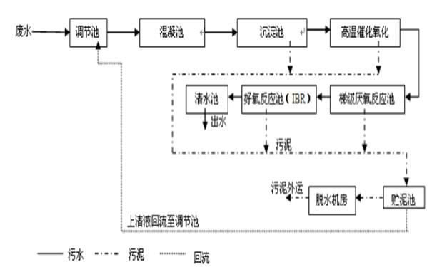 丙烯酸树脂生产废水首先进入调节池调节水质水量,并加药调节pH,然后投加混凝剂混凝,经过沉淀去除一部分有机物。沉淀池出水经加压进入高压热解氧化反应釜,对废水中的有机物进行剧烈氧化,将丙烯酸树脂废水废水中有毒有害物质氧化形成稳定的无机物与可生化的有机物,提高丙烯酸树脂废水废水的可生化性。经高压热解氧化的丙烯酸树脂废水经梯级厌氧池的厌氧菌进行厌氧处理,进一步去除废水的COD。梯级厌氧池出水再进入IBR好氧生化池,将废水中剩余的可降解物质进一步去除,使出水水质达到排放要求
